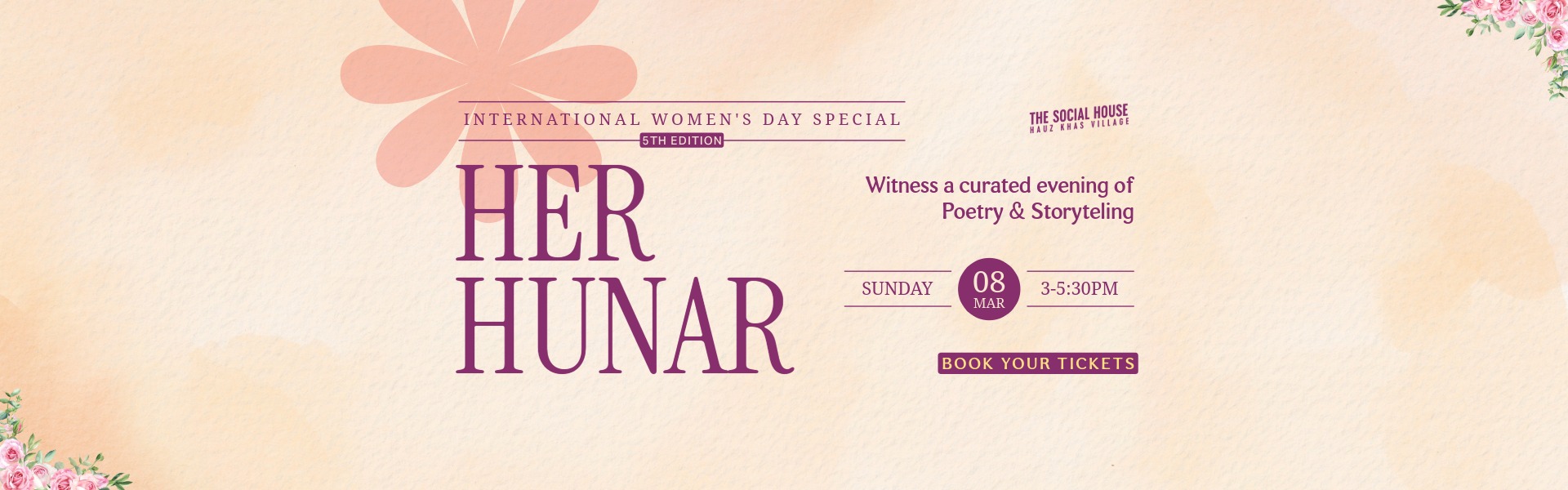 Her Hunar is an annual Women’s Day special showcase by The Social House, celebrating women in poetry, storytelling and stand-up comedy. Happening on 8 March in New Delhi at The Social House (Hauz Khas Village) , this curated live event features powerful performances by women artists across spoken word, kahaani and comedy. Designed for audiences who appreciate meaningful live shows, Her Hunar brings together diverse voices on one stage for an evening of expression, laughter and impact. If you are searching for Women’s Day events in Delhi, live poetry shows, storytelling events, or stand-up comedy nights on 8 March, Her Hunar is the place to be.